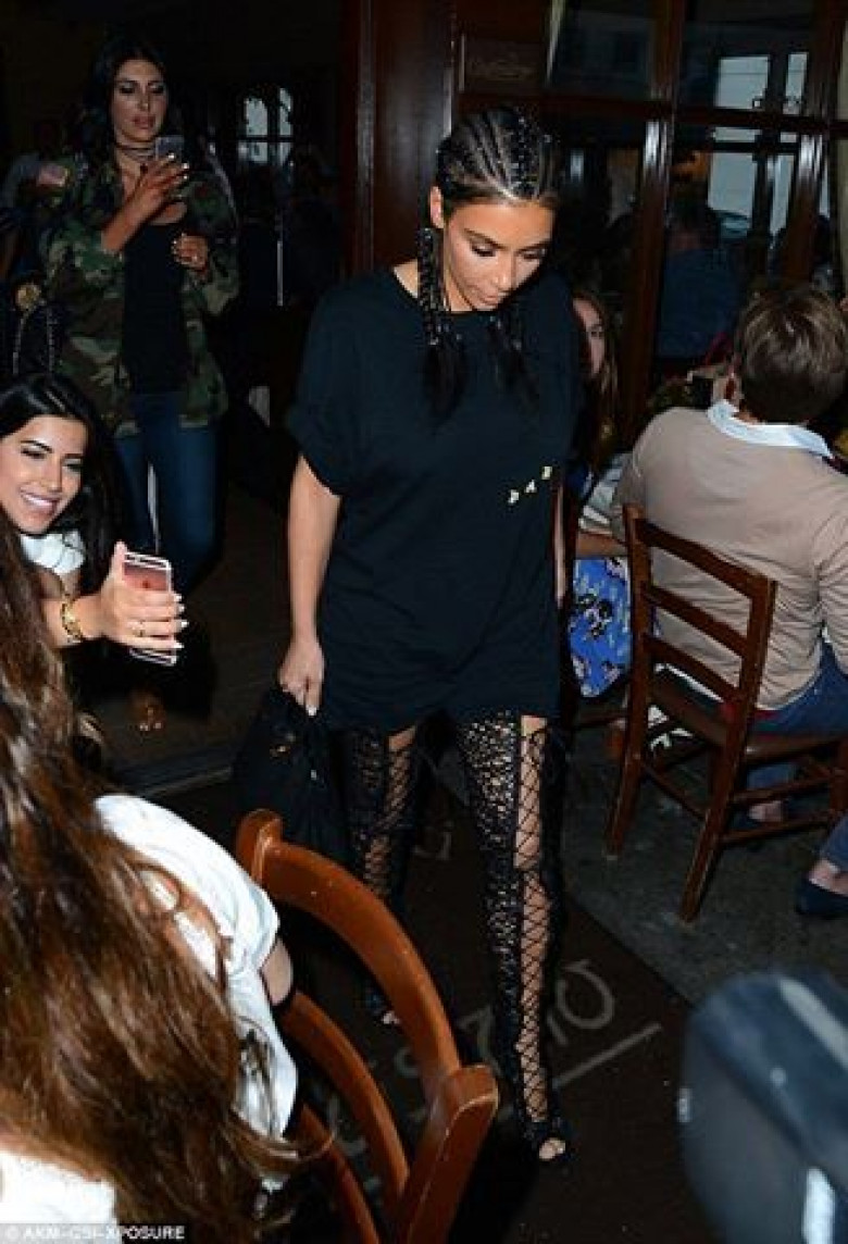 New look: Kim was sporting a brand new head of cornow braids for her dinner date with gal pal Brittny Gastineau