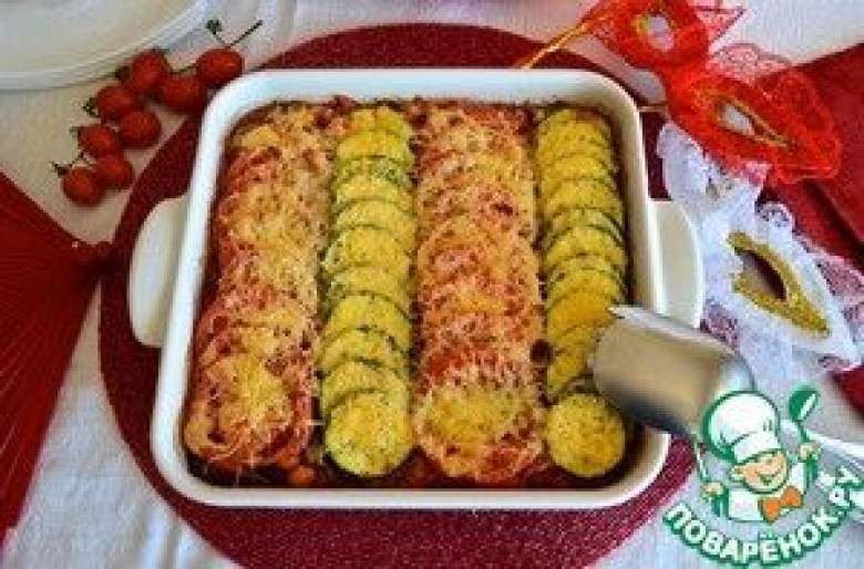 Ջեռոցի ամանի մեջ լցնել բանջարեղենային սոուսը, վրան շարել լոլիկն ու դդմիկը, քերել պանիրը, դնել ջեռոց, թխել 200 աստիճանով 15 րոպե։