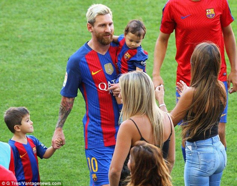 Barca boys: Accompanied by their sons, Thiago, three, and 10-month-old Mateo, Antonella made sure the Argentine forwards achievements were rewarded with love and affection
