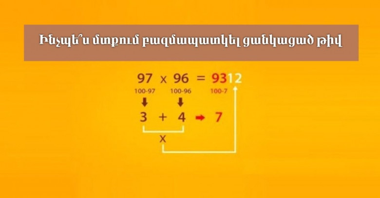 Ինչպե՞ս մտքում բազմապատկել ցանկացած թիվ Lifestyle 24 Օգոստոս, 2016 23:26 Կիսվել Blognews.am-ը գրում է. Այս եղանակով կարող եք հեշտությամբ բազմապատկել թվերը, ինչքան էլ որ դրանք մեծ լինեն: Կիսվել