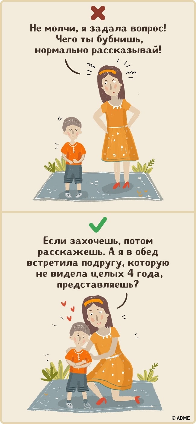 Եթե սկզբում երեխան չցանկանա պատասխանել այս հարցին և ասի, որ «նորմալ է ամեն ինչ» կամ «լավ է» , հարկավոր չէ նրան ստիպել ամեն ինչ պատմել: Պատմեք նրան ձեր օրվա մասին և հավատացեք, որ անգամ ամենաամաչկոտ երեխան կսկսի ձեզ հետ կիսվել: