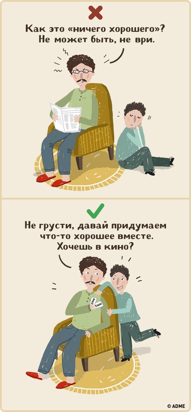 Երբ դրսում վատ եղանակ է կամ մաթեմատիկայի բարդ ստուգողական աշխատանքից հետո դժվար է ինչ-որ հաճելի բան հիշել, բայց հարկավոր է ինքնուրույն բարձրացնել սեփական տրամադրությունը: Օրինակ, այցելել կինո, միասին խաղեր խաղալ և այլն: Նման զբաղմունքները կարող են և ձեզ, և երեխային դուրս բերել վատ էմոցիոնալ վիճակից: