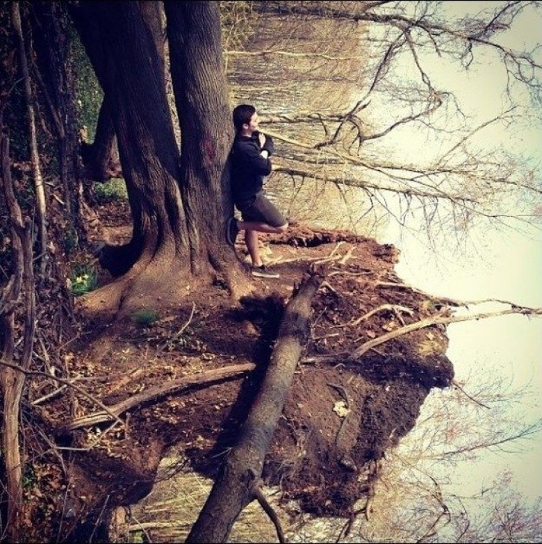 This is not a man standing beside a reflective lake.