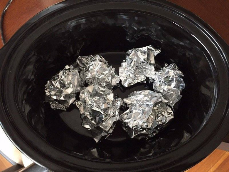 2. Փայլաթիթեղից պատրաստեք 5-6 հատ գնդիկներ և դրեք այն կաթսայի ներքևի հատվածում (կաթսայի հատակին): Գնդիկները կօգնեն, որ հավը հակասարաչափ տապակվի, և պառ-գրիլի ազդեցություն կստեղծի: