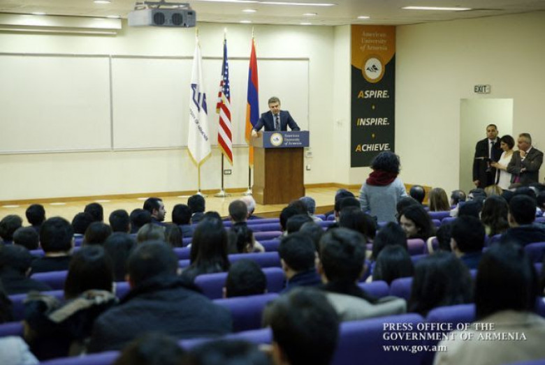 Այնուհետև կառավարության ղեկավարը հանդիպել է համալսարանի ուսանողներին և պատասխանել նրանց հետաքրքրող հարցերին: Վարչապետը նշել է, որ տպավորված է Ամերիկյան համալսարանով, այստեղ իրականացվող ուսումնառությամբ և ավելացրել, որ բուհի ղեկավարության հետ քննարկել են կրթական համակարգում տեղի ունեցող զարգացումներին, Ամերիկյան համալսարանի հետագա գործունեությանը, այստեղ առկա մթնոլորտը հայաստանյան մյուս բուհերում ևս ստեղծելու հնարավորություններին վերաբերող հարցեր: «Մի առիթով ինձ հարցրել են, թե ի՞նչպես եմ տեսնում վաղվա Հայաստանը: Իմ Õ �ատասխանը պատրաստված չէր և չէի ակնկալում, որ նման հարց կլինի. պատասխանը ձևակերպել եմ հետևյալ կերպ՝ անկախ, անվտանգ, արդար և ինտելեկտուալ Հայաստան: Այդ պատասխանի մեջ իրականում իմ աշխարհահայացքն է, այլ ոչ թե այն, որ լսողն ավելի դրական ինձ վերաբերվի: Ես ավելի քան համոզված եմ, որ ինտելեկտուալ բաղադրիչը մեր երկրին անհրաժեշտ է: Եթե չկարողանանք կիրթ, գրագետ քաղաքացի ունենալ, լավ երկիր չենք ունենա: Մենք դա կարո՞ղ ենք անել, թե ոչ՝ միանշանակ կարող ենք: Այդ առումով, կրթական համակարգին մեր կառավարությունը ցուցաբերելու է մաքսիմալ ուշադրություն: Մենք մե ծ հույսեր ենք կապում ձեզ հետ և մաղթում հաջողություններ, որ այստեղ առկա միջավայրը, մթնոլորտը տարածվի ամբողջ երկրով»,- ասել է վարչապետը: