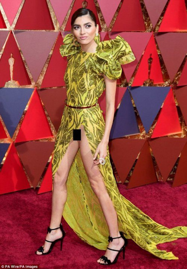 27-ամյա դերասանուհին ներկայացել է հսկայական կտրվածքով դեղին զգեստով, որը մերկացրել է ոչ միայն նրա ոտքերը, այլեւ ցուցադրել ներքնազգեստի բացակայությունը: