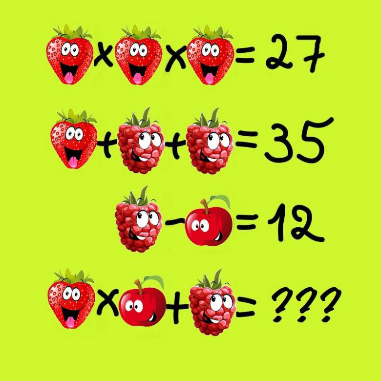Օգնեք մրգերին լուծել խնդիրը Lifestyle 15 Մարտ, 2017 11:16 Կիսվել Նախքան ճիշտ պատասխանը նայելը փորձեք ինքներդ լուծել այս հետաքրքիր և ոչ բարդ խնդիրը․ Պատասխանը կարող եք ստուգել այստեղ Կիսվել