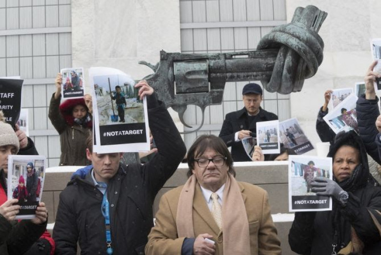 Նյու Յորքում համաշխարհային կազմակերպության կենտրոնակայանի անձնակազմը, չնայած մինուսային ջերմաստիճանին, կեսօրին հավաքվել Է Գլխավոր ասամբլեայի շենքի առջեւ՝ հանգույցով կապված ատրճանակի՝ հռչակավոր քանդակի մոտ: ՄԱԿ-ի աշխատակիցներից շատերը ձեռքներին բռնել Էին սիրիացի երեխաների լուսանկարներ: Նրանց հեռակա միացել են գործընկերներն ամբողջ աշխարհում, որոնք անցկացրել են խորհրդանշական լռության րոպե: