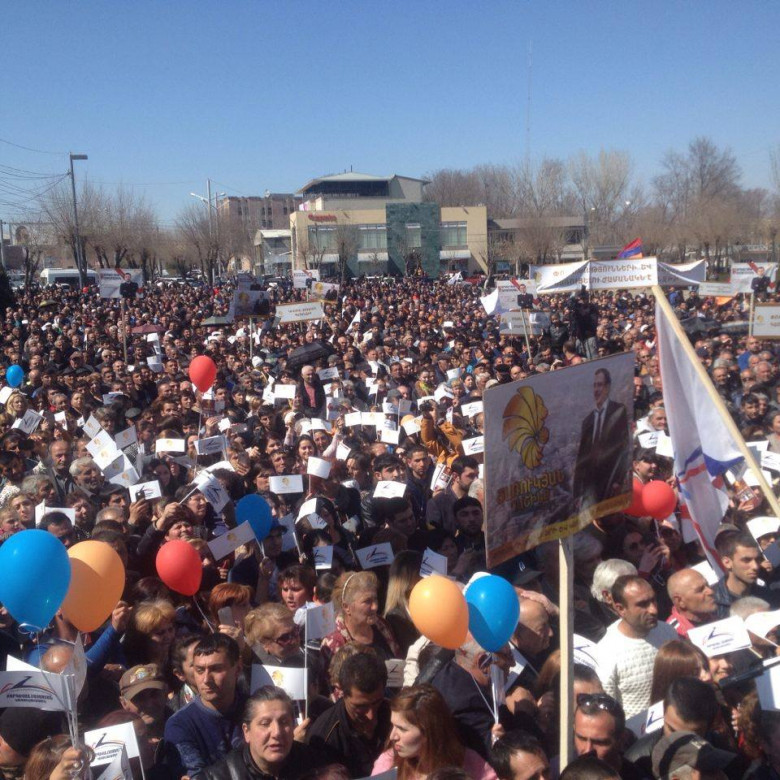 Հրապարակում, որտեղ հավաքվել էր էլեկտորատը, անգամ ասեղ գցելու տեղ չկար: Մարդիկ մեծ ոգևորությամբ ողջունեցին ինչպես Ծառուկյան դաշինքի առաջնորդ, ԲՀԿ նախագահ Գագիկ Ծառուկյանին, այնպես էլ նույն դաշինքի ռեյտինգային թեկնածու Արգամ Աբրահամյանին: