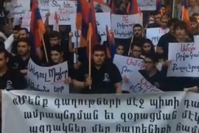 Բողոքի ակցիային մասնակից մի քանի տասնյակ հայ երիտասարդներ պահել են Հայաստանի դրոշներ ու գրություններ` կոչ անելով չհարստացնել թշնամուն: