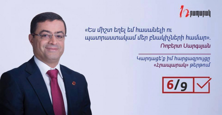 Ինձ համար իսկապես մեծ պատիվ է, որ Հանրապետական կուսակցությունն այս անգամ էլ վստահեց ինձ ու առաջարկեց ռեյտինգային ընտրակարգով առաջադրվել թիվ 1 ընտրատարածքում՝ հնարավորություն տալով հենց ա՛յս կարգավիճակով շարունակել օգտակար լինել մեր քաղաքացիներին: