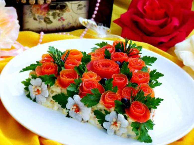 Լոլիկը մաքրել, վարդի տեսք տալ ու զարդարել աղցանը: