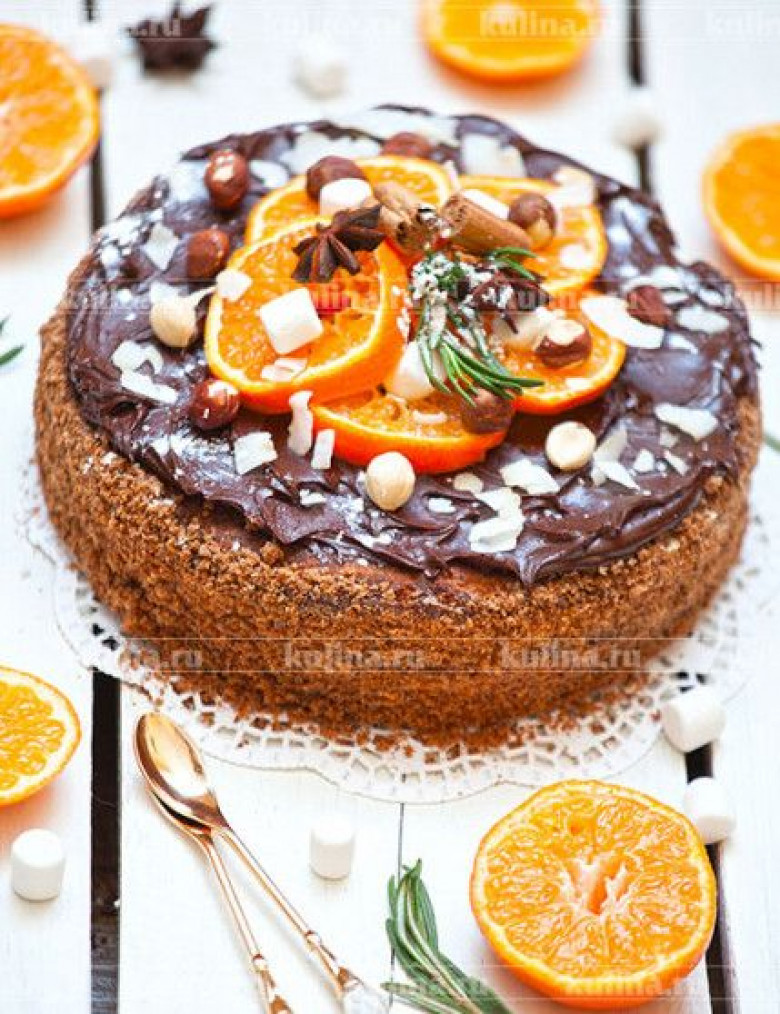 Украсьте торт мандаринами, орехами, пряностями, травками и кокосовыми кранчами. Уберите торт в холодильник до подачи. Разрежьте торт на порционные куски и подайте к столу.