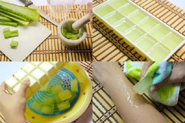 Ալոեի թարմ հյութը սառեցրու սառույցի ձևամանով: Դրանցով ամեն առավոտ սրբիր դեմքդ: Այս միջոցը հրաշալիորեն վերացնում է բորբոքումները, կարմրությունը, փրկում է այրվածքների դեպքում: