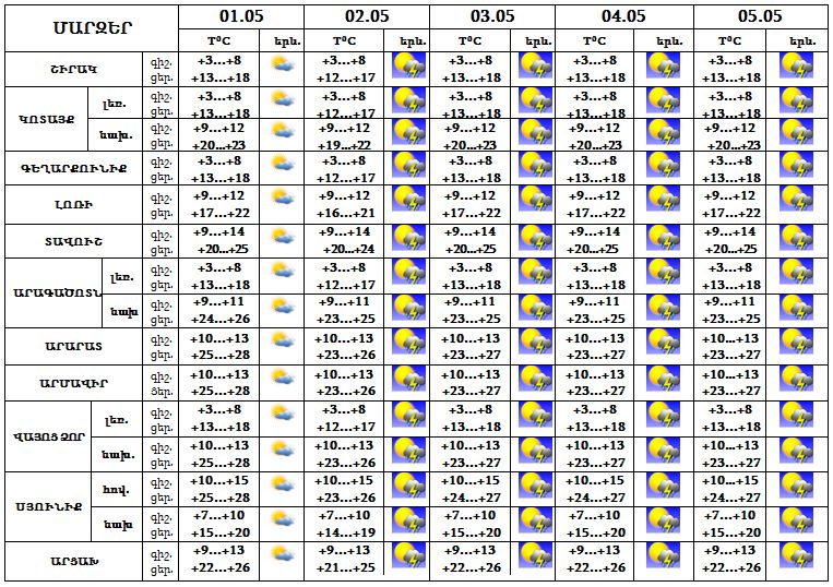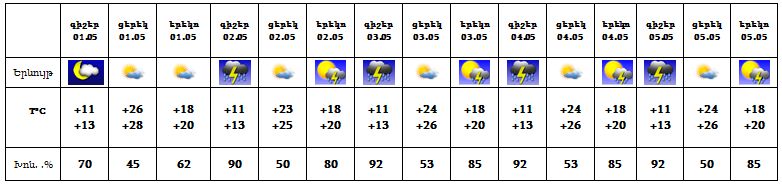 Հանրապետության տարածքում մայիսի 1-ին սպասվում է առանց տեղումների եղանակ, մայիսի 2-5-ը՝ գիշերը և կեսօրից հետո, շրջանների մեծ մասում սպասվում է անձրև և ամպրոպ, առանձին վայրերում հնարավոր է կարկուտ: