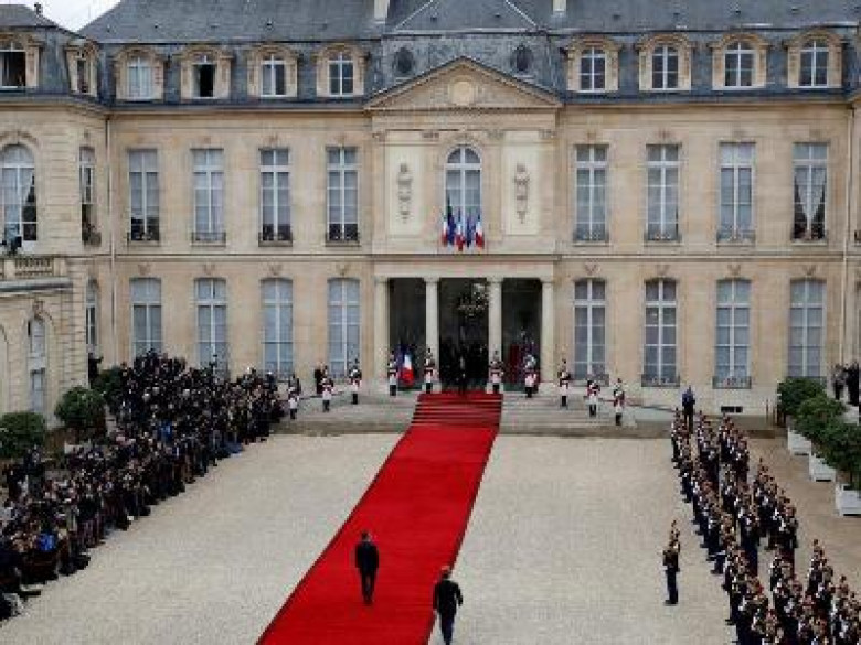 Ֆրանսուա Օլանդը Էմանուել Մկարոնին դիմավորել է Ելիսեյան պալատի մուտքի մոտ, որից հետո երկու նախագահներ հանդիպում են անցկացրել փակ դռների հետեւում, որի ընթացքում Օլանդը Մակրոնին է փոխանցել «միջուկային արկղիկի» գաղտնագիրը: