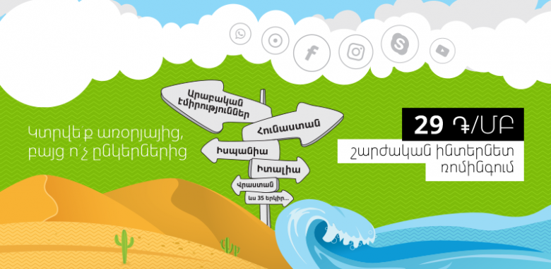 Ավելին՝ շարժական ինտերնետի հատուկ՝ 29 դրամ/ՄԲ սակագինը կգործի ոչ միայն ամենահայտնի երկրներում, այլև Արաբական Միացյալ Էմիրություններում ճամփորդելիս: Այստեղ միանալով Etisalat ցանցին բաժանորդները կօգտվեն 400 դրամ հատուկ սակագնից մուտքային, տեղական, միջազգային զանգերի, դեպի Հայաստան զանգերի և կարճ հաղորդագրությունների համար:
