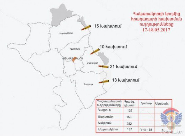 ՀասարակությունՄայիսի 17-ին եւ լույս 18-ի գիշերը արցախա-ադրբեջանական հակամարտ զորքերի շփման գծում հակառակորդը տարբեր տրամաչափի հրաձգային զինատեսակներից, հրադադարի պահպանման ռեժիմը խախտել է մոտ 60 անգամ՝ հայ դիրքապահների ուղղությամբ արձակելով ավելի քան 650 կրակոց:
