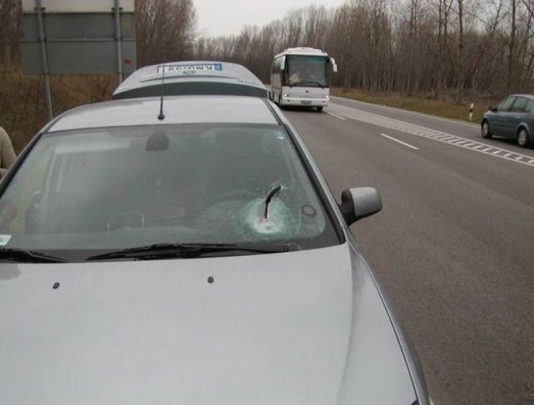 Դեպքը տեղի է ունեցել եվրոպական երկրներից մեկում: Բեռնատար մեքենայի արգելակման կոճղակը (колодка) չգիտես թե ինչպես պոկվել և մխրճվել է հետևից ընթացող մարդատար մեքենայի դիմապակուն: Միայն հրաշքով այն չի վնասել վարորդին, քանի որ հենց նրա ուղղությամբ է թռչել և նույնիսկ մի հատված սրահում է հայտնվել: