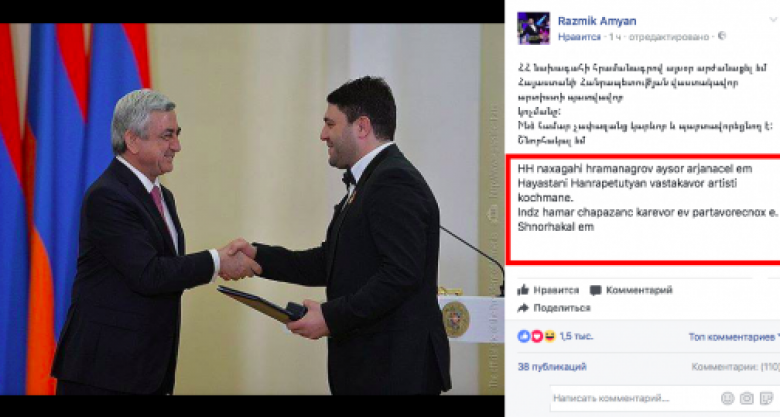 Ինչից հետո երգիչը ֆեյսբուքյան իր պաշտոնական էջում հայատառ գրառում է կատարել այդ կապակցությամբ, և գրառման ներքևում նույնը գրել է նաև լատինատառ: