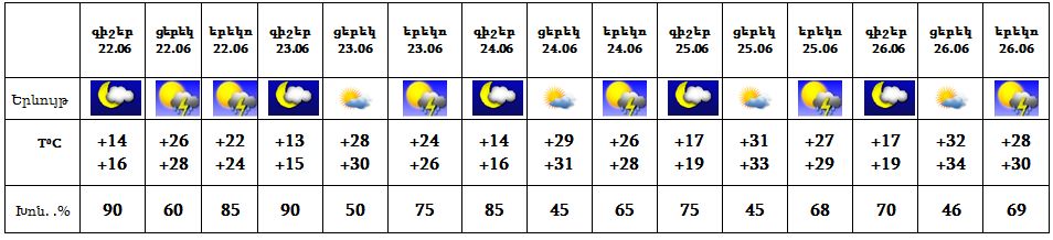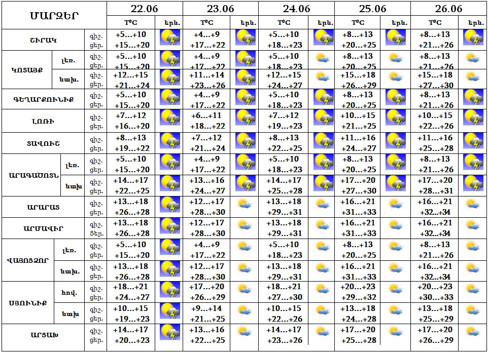 Հանրապետության տարածքում հունիսի 22-ին ժամանակ առ ժամանակ շրջանների զգալի մասում, 23-26-ը՝ երեկոյան ժամերին, հիմնականում հյուսիսային շրջաններում սպասվում է անձրև և ամպրոպ, ամպրոպի ժամանակ՝ քամու ուժգնացում՝ 20-25 մ/վ, առանձին վայրերում հնարավոր է կարկուտ: