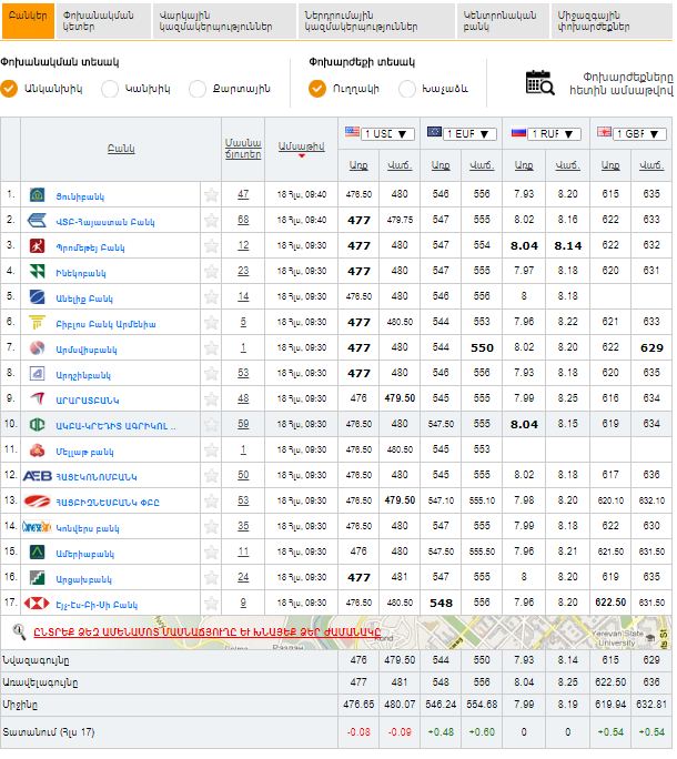 Ամերիկյան մեկ դոլարը գնվում է 476 ՀՀ դրամ նվազագույն և 477 առավելագույն փոխարժեքով, վաճառվում` 479.50 ՀՀ դրամ նվազագույն և 480.50 առավելագույն փոխարժեքներով: