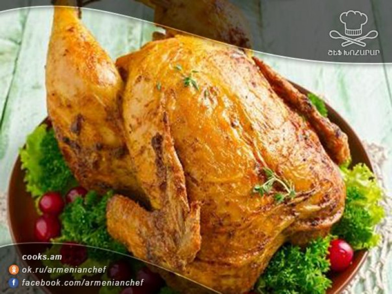 - Երբ հավը կարմրի, փայտիկով կամ պատառաքաղով փորձում ենք, եթե պատրաստ է, ջեռոցից հանում ենք։