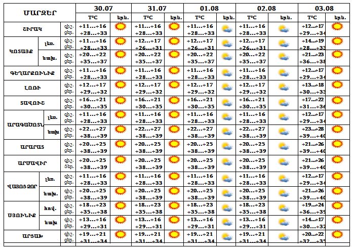 Հուլիսի 30-ից օգոստոսի 03-ին հանրապետությունում սպասվում է բարձր ջերմային ֆոն, Երևանում, Արարատյան դաշտում և Սյունիքի հովիտներում ցերեկը կանխատեսվում է մինչև +38...+39 աստիճան տաքություն և բարձր կարգի հրդեհավտանգ իրավիճակ: Օդի միջին օրական ջերմաստիճանն այդ օրերին բարձր կլինի նորմայից 4-6 աստիճանով: