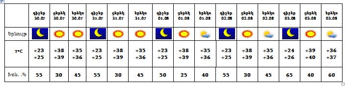 Հուլիսի 30-ից օգոստոսի 3-ը սպասվում է առանց տեղումների եղանակ: Քամին՝ հարավ-արևմտյան՝ 3-8մ/վ: Օդի ջերմաստիճանն էապես չի փոխվի: