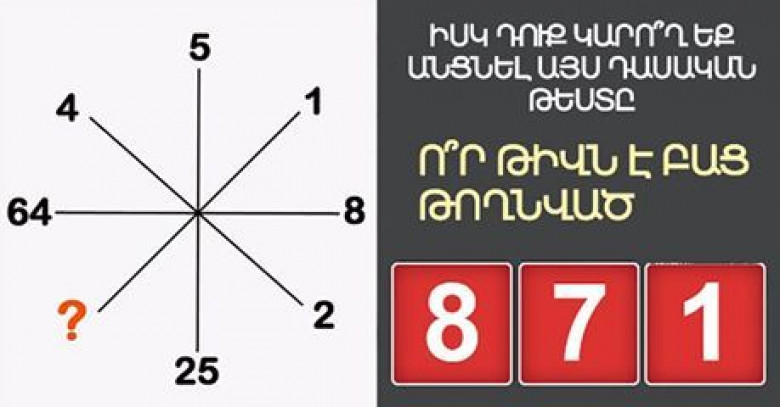 Նայեք ներքևում բերված նկարը և փորձեք հասկանալ՝ ինչ թիվ պետք է լինի հարցական նշանի փոխարեն: Արդեն կռահեցի՞ք: Դե ինչ, հիմա կտեսնենք՝ արդյոք ճիշտ ընտրություն կատարեցիք: