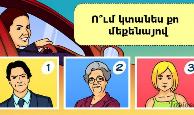 Առօրյայում մենք հաճախ ենք ստիպված ընտրության առջև կանգնում: Երբեմն թվում է՝ ողջ կյանքը ընտրությունների շարան է: Առաջարկում ենք անցնել այս թեստը, որը կօգնի ճանաչելու ինքներդ ձեզ: Պարզապես ընտրեք, թե ում կուզենայիք տանել ձեր մեքենայով: