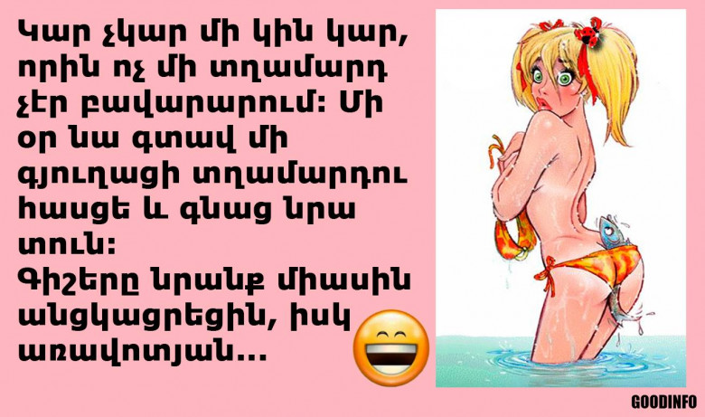 Կար չկար մի կին կար, որին ոչ մի տղամարդ չէր բավարարում. Մի օր նա գտավ մի գյուղացի տղամարդու հասցե և գնաց նրա տուն: Գիշերը նրանք միասին անցկացրեցին, իսկ առավոտյան կինը տղամարդուն ասաց.