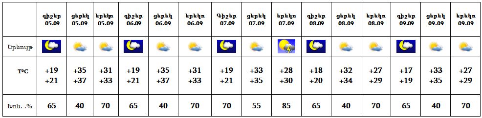 Սեպտեմբերի 5-6-ը, 8-9-ը սպասվում է առանց տեղումների եղանակ, 7-ին՝ երեկոյան ժամերին, սպասվում է ամպրոպ, առանձին հատվածներում կա կարճատև անձրևի հավանականություն: