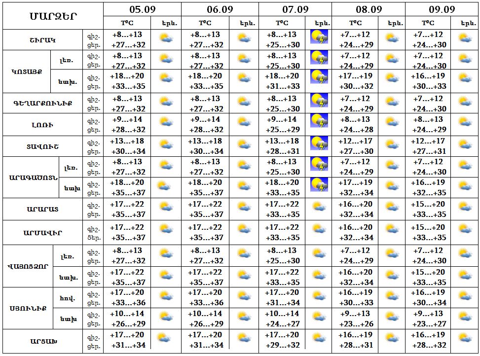 Սեպտեմբերի 5-6-ը, 8-9-ը սպասվում է առանց տեղումների եղանակ, 7-ին առավելապես հյուսիսային շրջաններում երեկոյան ժամերին սպասվում է կարճատև անձրև և ամպրոպ, ամպրոպի ժամանակ՝ քամու ուժգնացում՝ 15-20 մ/վ: