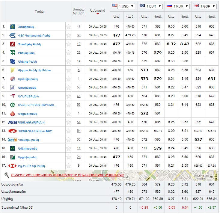 Ռուսական ռուբլին գնվում է 8.42 դրամ նվազագույն և 8.60 դրամ առավելագույն փոխարժեքով, վաճառվում` 8.42 դրամ նվազագույն և 8.60 դրամ առավելագույն փոխարժեքով: