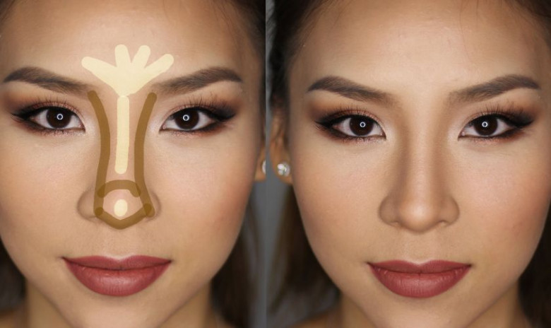Նախ պետք է դեմքին հավասարաչափ քսել տոնը, որը մոտ է մաշկի գույնին, եթե ուզում եք կարճացնել երկարությունը, մուգ երանգը պետք կլինի, պետք է քսել հիմքին, թևերին, ծայրին: Եթե քիթը լայն է, մուգը քսում ենք կողային գծերին և թևերին: