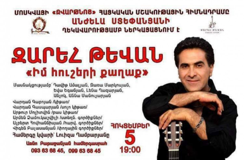 Երգչի հետ հանդիպեցինք մենահամերգից առաջ և հարստացանք հույզերով` իմանալով, որ Առնո Բաբաջանյան հաերգասրահում ներկա ենք լինելու երգի ու ասմունքի միաձուլվածքից ստացված հարմոնիկ մի երեկոյի` «Իմ հուշերի քաղաք» խորագրով: Past.am-ի հետ զրույցում Զարեհն ասաց, որ համերգի ընթացքում կհնչեն իր հեղինակային երգերը, ինչպես նաև սեփական քերթվածները Աննա Մանուչարյանի և Հռիփսիմե Սարգսյանի շուրթերով, կլինեն նաև պրեմիերաներ: Համերգային երեկոն հարուստ է լինելու նաև զուգերգերով ու այլ անակնկալներով: Կենդանի նվագակցությունը կներթափանցի ներկաների հոգևոր աշխարհ Զարեհ Թևանի կատարողական արվեստի հմտությամբ համատեղ :