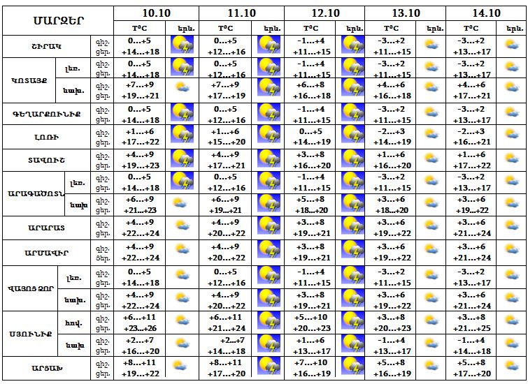 Օդի ջերմաստիճանը 11-12-ը կնվազի 3-4 աստիճանով, 13-14-ը կբարձրանա 2-3 աստիճանով: