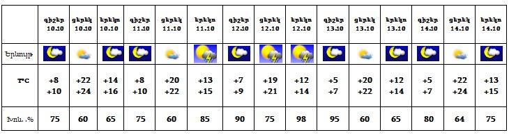 Երևան քաղաքում հոկտեմբերի 10-ին, 13-14-ը սպասվում է առանց տեղումների եղանակ: 11-12-ը՝ երեկոյան ժամերին, սպասվում է անձրև և ամպրոպ:
