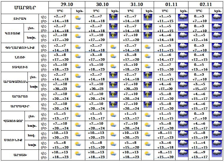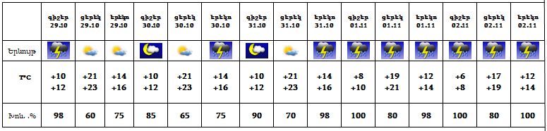 Երևան քաղաքում հոկտեմբերի 29-ի գիշերը, նոյեմբերի 1-2-ը սպասվում է, 30-31-ը հնարավոր է անձրև և ամպրոպ նաև քամու ուժգնացում՝ 12-17 մ/վ արագությամբ: 29-ի ցերեկը սպասվում է առանց տեղումների եղանակ:
