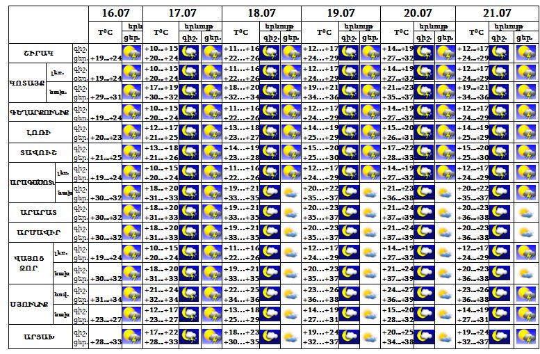 Հուլիսի 16-ի ցերեկը, 17-ի գիշերը և կեսօրից հետո սպասվում է, 18-ին, 21-ի երեկոյան ժամերին քաղաքի առանձին հատվածներում հնարավոր է անձրև և ամպրոպ, ամպրոպի ժամանակ` քամու ուժգնացում՝ 15-20 մ/վ արագությամբ: Հուլիսի 19-20-ը սպասվում է առանց տեղումների եղանակ:
