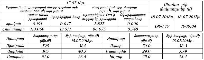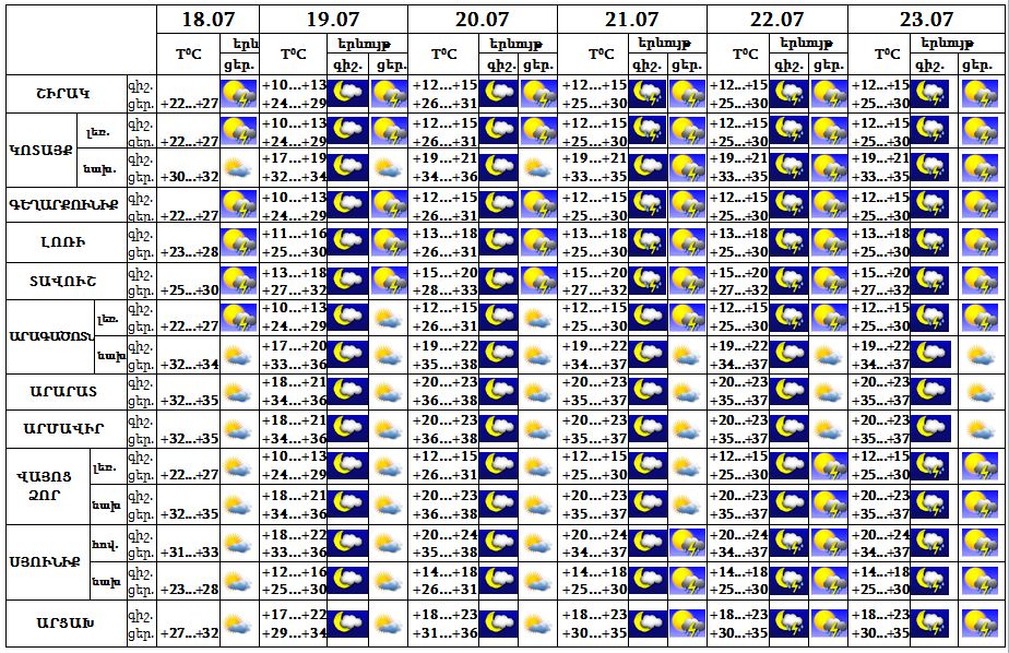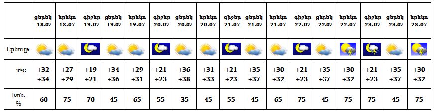 Հուլիսի 18-ի ցերեկը, 19-21-ը սպասվում է առանց տեղումների եղանակ, 22-23-ի կեսօրից հետո սպասվում է անձրև և ամպրոպ, ամպրոպի ժամանակ` քամու ուժգնացում՝ 15-20 մ/վ արագությամբ: