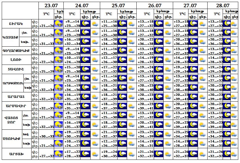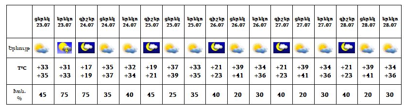 Երևան քաղաքում` հուլիսի 23-ին՝ կեսօրից հետո, սպասվում է անձրև և ամպրոպ, ամպրոպի ժամանակ՝ քամու ուժգնացում՝ 15-20 մ/վ արագությամբ: Հուլիսի 24-28-ը սպասվում է առանց տեղումների եղանակ:
