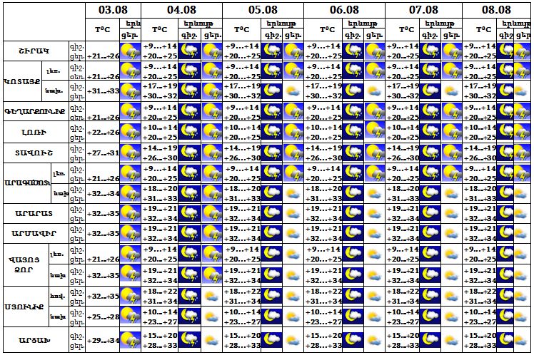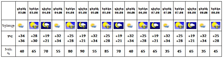 Երևանում օգոստոսի 3-ի երեկոյան ժամերին, 4-ի գիշերը և երեկոյան ժամերին, 5-8-ի երեկոյան ժամերին քաղաքի առանձին հատվածներում հնարավոր է անձրև և ամպրոպ, ամպրոպների ժամանակ` քամու ուժգնացում` 18-20 մ/վ: