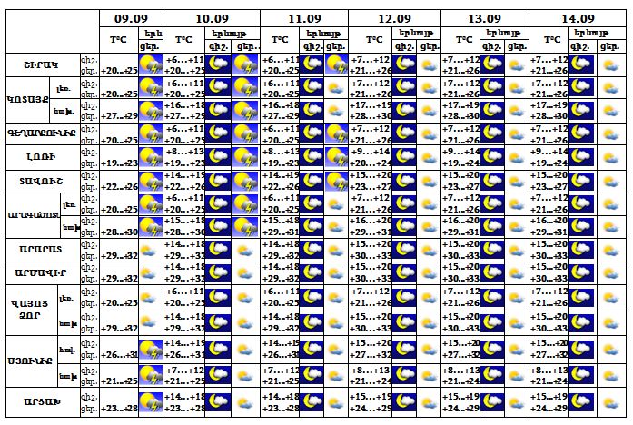 ՀասարակությունՀայաստանի առանձին շրջաններում սեպտեմբերի 9-ին, իսկ 10-11-ը՝ հյուսիսային շրջաններում երեկոյան ժամերին սպասվում է կարճատև անձրև և ամպրոպ, առանձին հատվածներում հնարավոր է նաև կարկուտ: Սեպտեմբերի 12-14-ն սպասվում է առանց տեղումների եղանակ:
