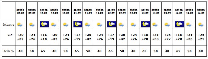 Ինչպես «Արմենպրես»-ին տեղեկացրին ՀՀ տրանսպորտի, կապի և տեղեկատվական տեխնոլոգիաների նախարարության լրատվական ծառայությունից, Երևան քաղաքում սեպտեմբերի 9-ի ցերեկը և 10-14-ն սպասվում է առանց տեղումների եղանակ: