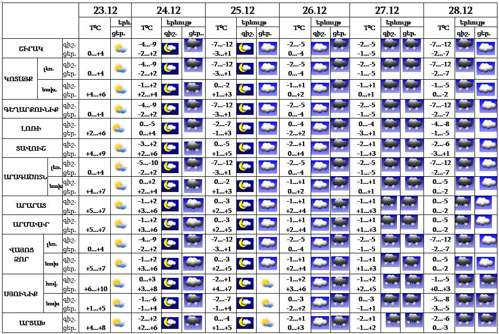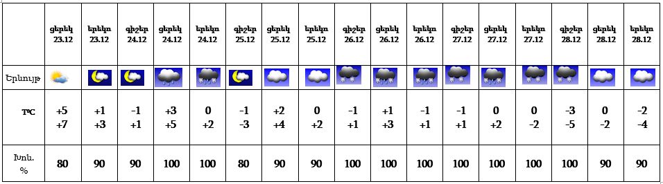 Հայաստանի տարածքում դեկտեմբերի 23-ին, 24-ի գիշերը, 25-ին սպասվում է առանց տեղումների եղանակ: Դեկտեմեների 24-ի ցերեկը, 26-ի օրվա երկրորդ կեսին, 27-ին, 28-ի գիշերը շրջանների զգալի մասում, 28-ի ցերեկը՝ Սյունիքում և Արցախում սպասվում են տեղումներ և մառախուղ, լեռնային և նախալեռնային շրջաններում՝ ձյուն։