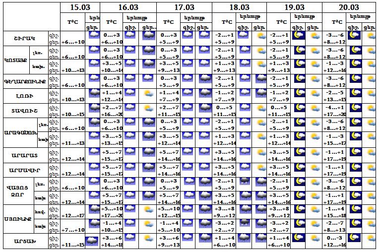 Երևան քաղաքում՝ մարտի 15-ի ցերեկը, 16-18-ը սպասվում է կարճատև անձրև: Մարտի 19-20-ը սպասվում է առանց տեղումների եղանակ: