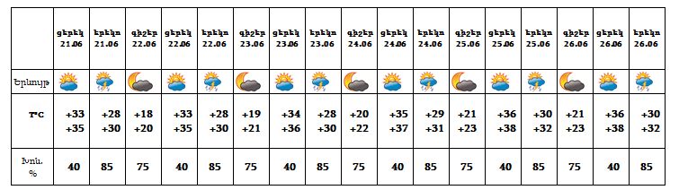 Հունիսի 21-26-ը` հատկապես գիշերը և կեսօրից հետո, քաղաքի առանձին հատվածներում սպասվում է կարճատև անձրև և ամպրոպ, ամպրոպի ժամանակ` նաև քամու ուժգնացում` մինչև 15-20 մ/վ արագությամբ: