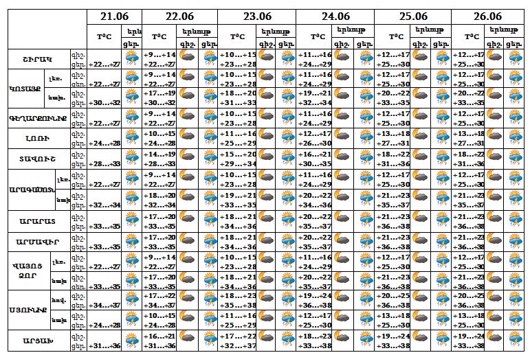 Հունիսի 21-26-ը` գիշերը և կեսօրից հետո, շրջանների զգալի մասում սպասվում է կարճատև անձրև և ամպրոպ, առանձին վայրերում հնարավոր է կարկուտ: